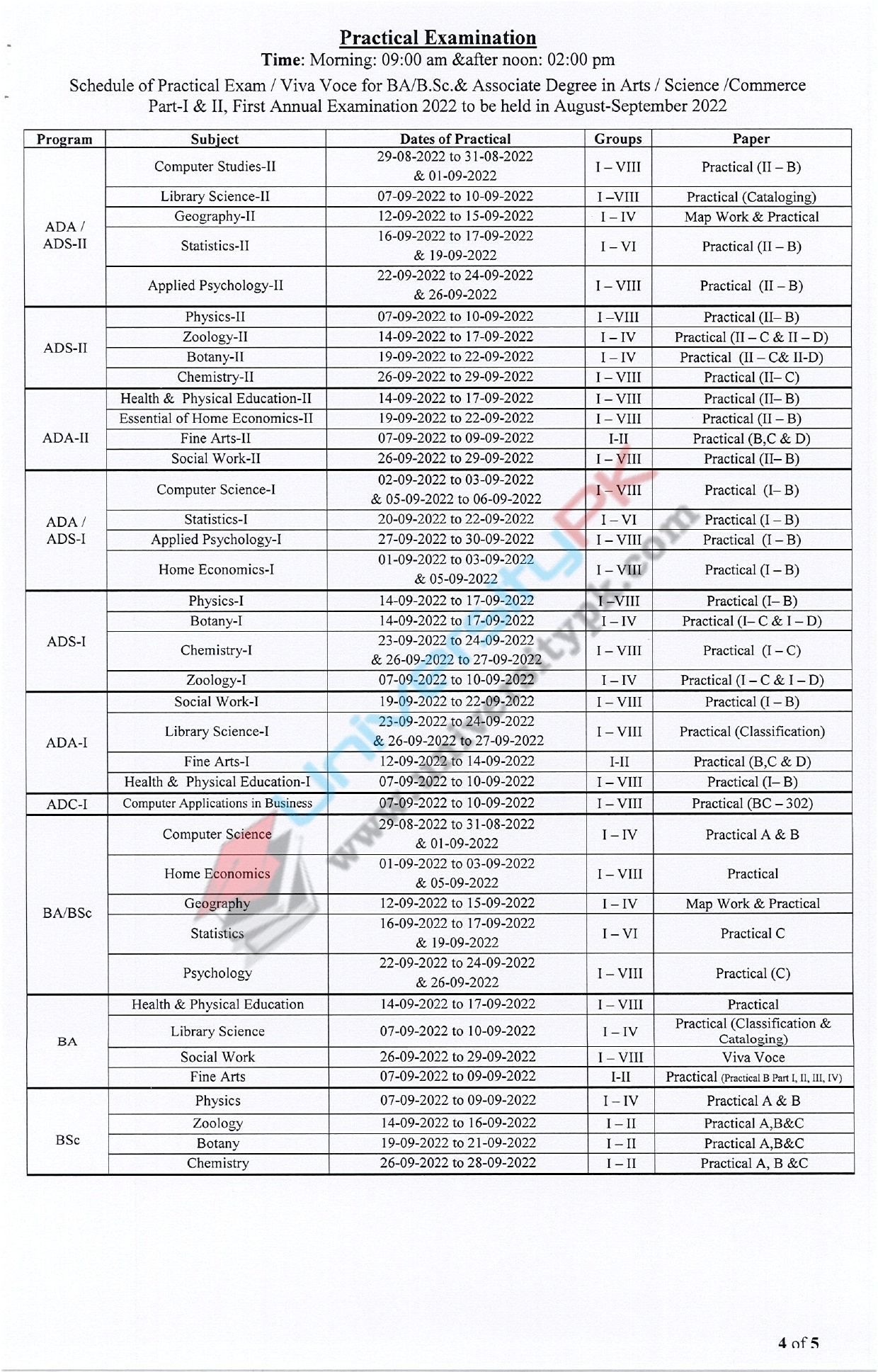 Date Sheet of BA/BSc/B.Com/ADA/ADS/ADC Annual Exam 2022 Sargodha University
