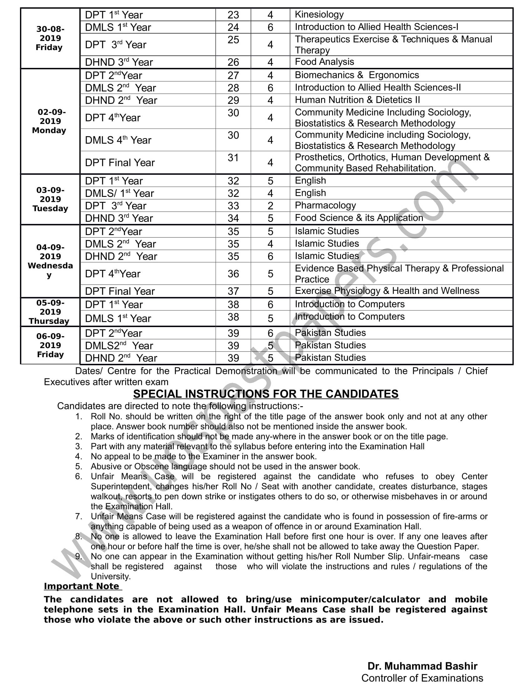 Doctor of Physical Therapy 1st, 2nd, 3rd , 4th, & Final Year, Doctor of Medical & Lab Sciences 1st, 2nd, 3rd & 4th Year Doctor of Human Nutrition & Dietetics 2nd & 3rd Year Supplementary Examinations 2018