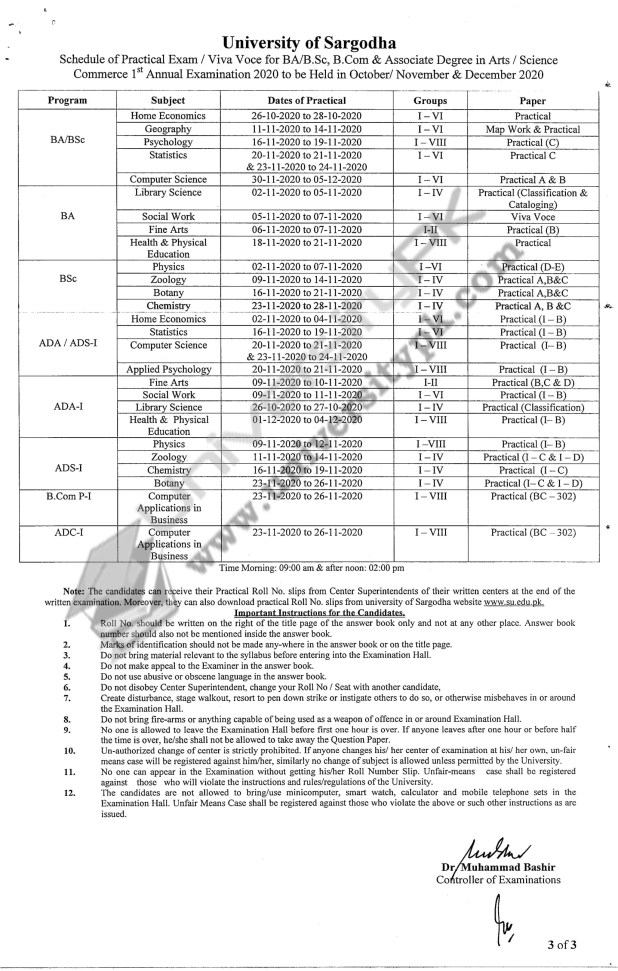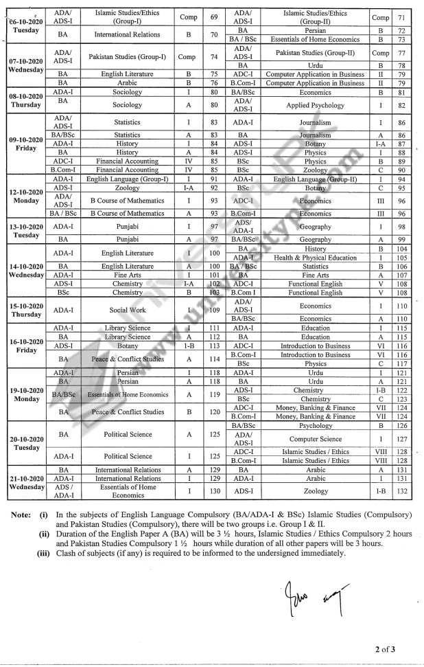 Date Sheet of BA / BSc/B.Com and ADP 1st Annual Examination 2020 University of Sargodha