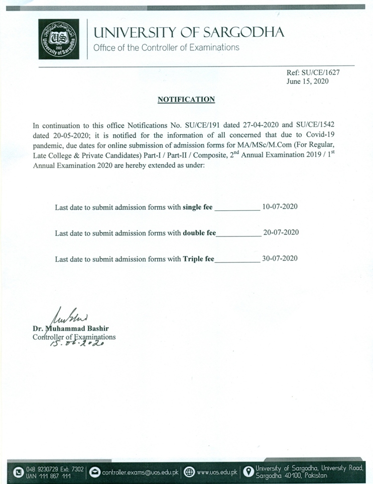 Sargodha university ma msc admission last date 2020